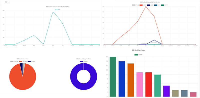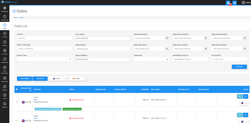 商家(Merchant)可以对接去平台的多个账号,这包含了库存,订单,面单等对接。系统也有Shopee,Lazada,Tiktok 商品管理。 商家也可以随时登录去前台查看库存,库存分析,个别商品的销售统计报告,盘点报告,仓库柜子图片和运单等资料。不需要每一样事情都麻烦仓库了。